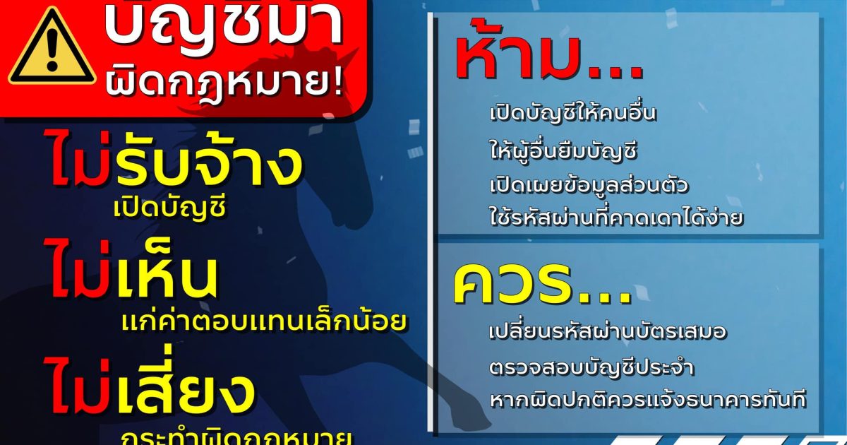 ตำรวจไซเบอร์ ฝากเตือนภัยมิจฉาชีพหลอกลวงให้เปิดบัญชีธนาคาร(บัญชีม้า)และเปิดซิม